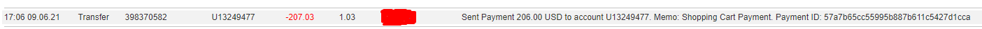 06.07.21 03:46 Account Transfer -150.00 Sent Payment: 150.00 USD to account U13249477. Batch: 397813123. Memo: Shopping Cart Payment.