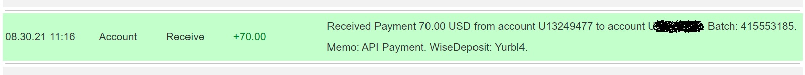 08.30.21 11:16 Account Receive +70.00 Received Payment 70.00 USD from account U13249477 to account. Batch: 415553185. Memo: API Payment. WiseDeposit: Yurbl4.