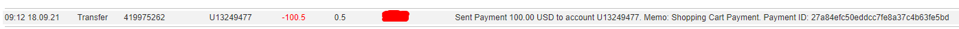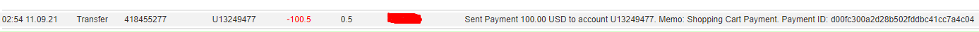 05:24 06.09.21 Transfer 417422226 U13249477 -301.5 Sent Payment 300.00 USD to account U13249477. Memo: Shopping Cart Payment. Payment ID: 554651563a4ee791bba3b5f32a19a4d0