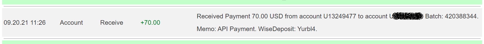 09.20.21 11:26 Account Receive +70.00 Received Payment 70.00 USD from account U13249477. Batch: 420388344. Memo: API Payment. WiseDeposit: Yurbl4.
