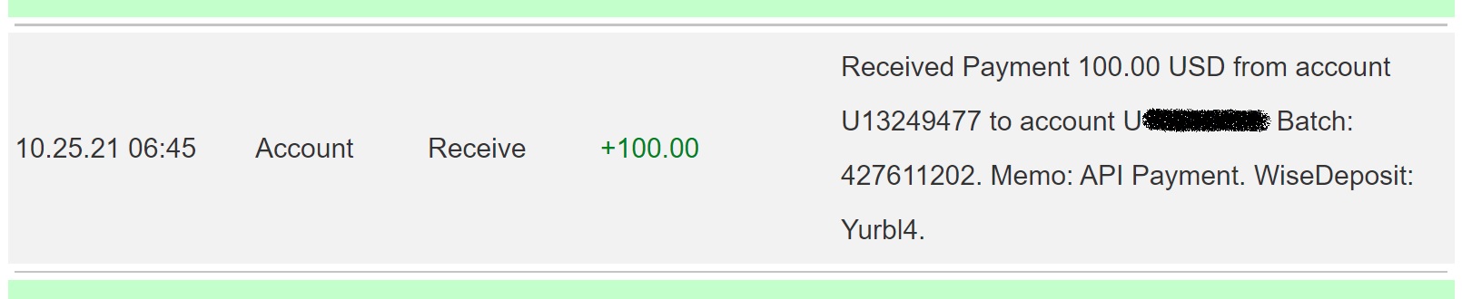 10.11.21 06:46 Account Receive +100.00 Received Payment 100.00 USD from account U13249477. Batch: 424823139. Memo: API Payment. WiseDeposit: Yurbl4.