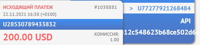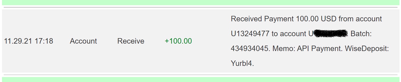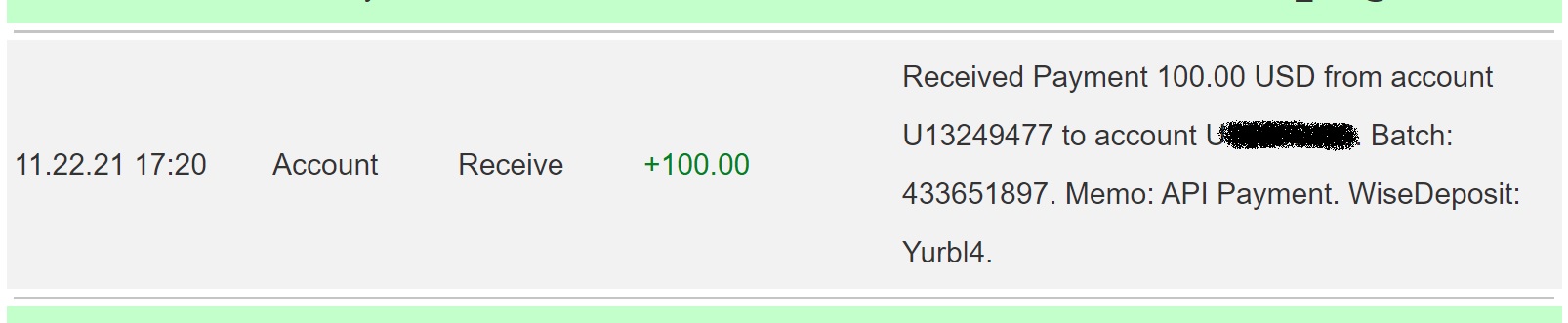 11.22.21 17:20 Account Receive +100.00 Received Payment 100.00 USD from account U13249477. Batch: 433651897. Memo: API Payment. WiseDeposit: Yurbl4.