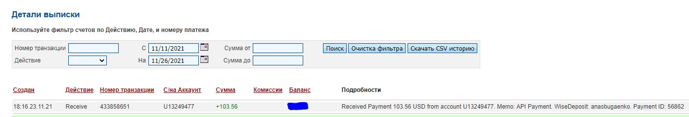 05:35 22.11.21 +100.00 Received Payment 100.00 USD from account U13249477. Batch: 433532400 Memo: API Payment. WiseDeposit: annakom875. Payment ID: 56724