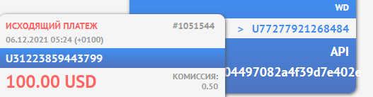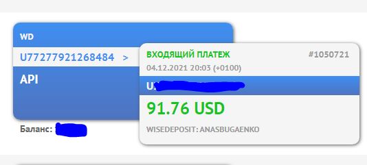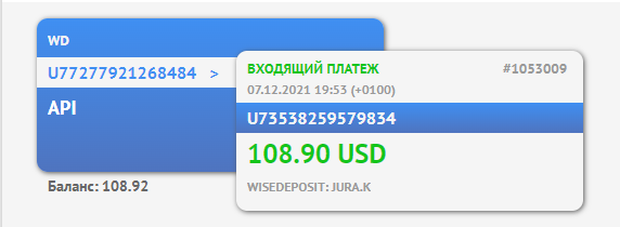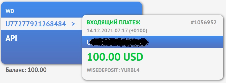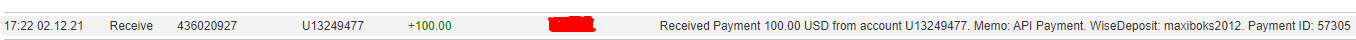 12.06.21 05:16 Account Receive +100.00 Received Payment 100.00 USD from account U13249477. Batch: 436593120. Memo: API Payment. WiseDeposit: Yurbl4.