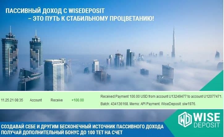 Привет участникам Wisedeposit! Получил очередную выплату из проекта. Утром заказал 100 $ и через час деньги были зачислены в кошелек. Спасибо админам и всем участникам проекта!