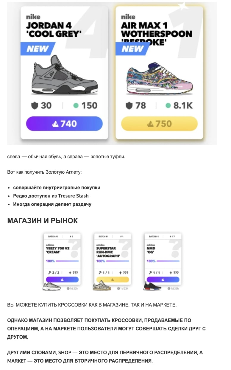 Игра превращает ваши физические шаги в Aglet [внутриигровую валюту], которую вы можете использовать для покупки и сбора виртуальных кроссовок от таких брендов, как Nike, Jordan, Adidas и Yeezy (и это только некоторые из них). Кстати говоря, насколько я понял, они выдают настоящие кроссовки, как часть вознаграждения. На данный момент игроки из Ливерпуля, Великобритания, Мельбурна, Австралия, Чикаго, США и других городов уже получали настоящие кроссовки.