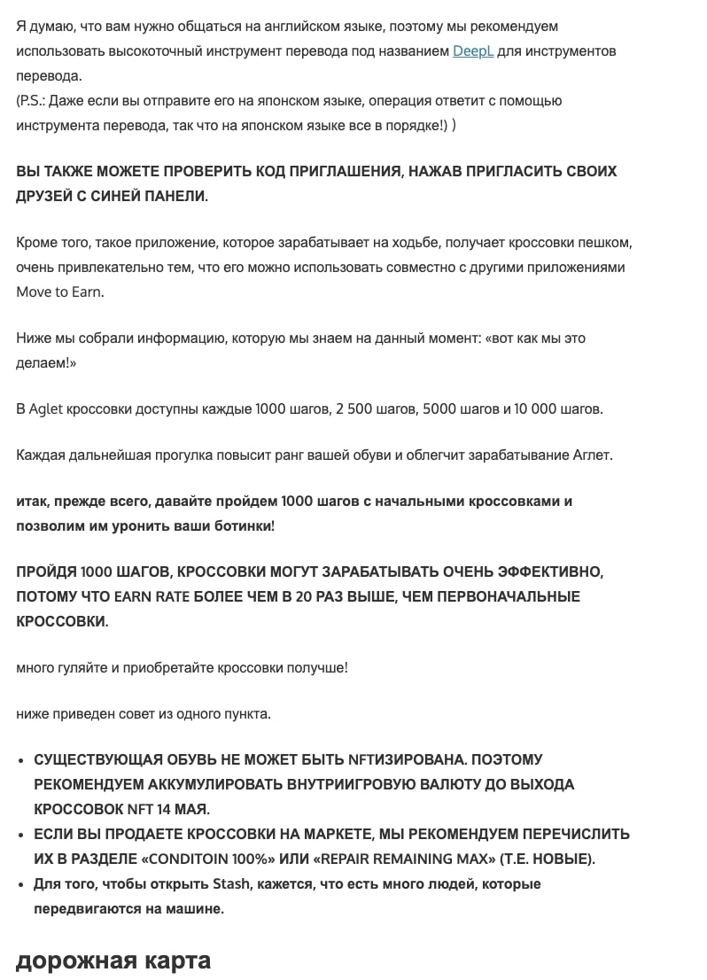• Q3 2022 - Минт Aglet NFT в тайниках с сокровищами по всему миру; Дополнительные дропы в магазине кроссовок IRL, связанные с NFT; Эксклюзивный/ранний доступ к дропам Aglet Merch.