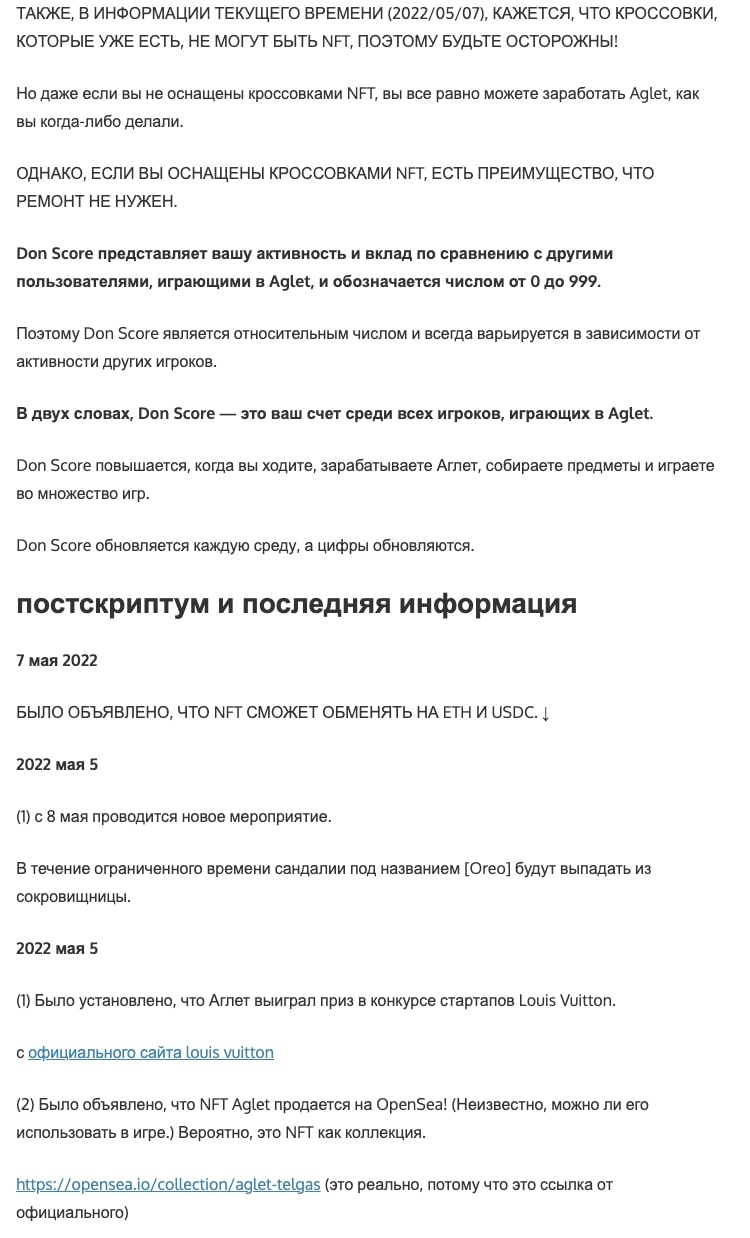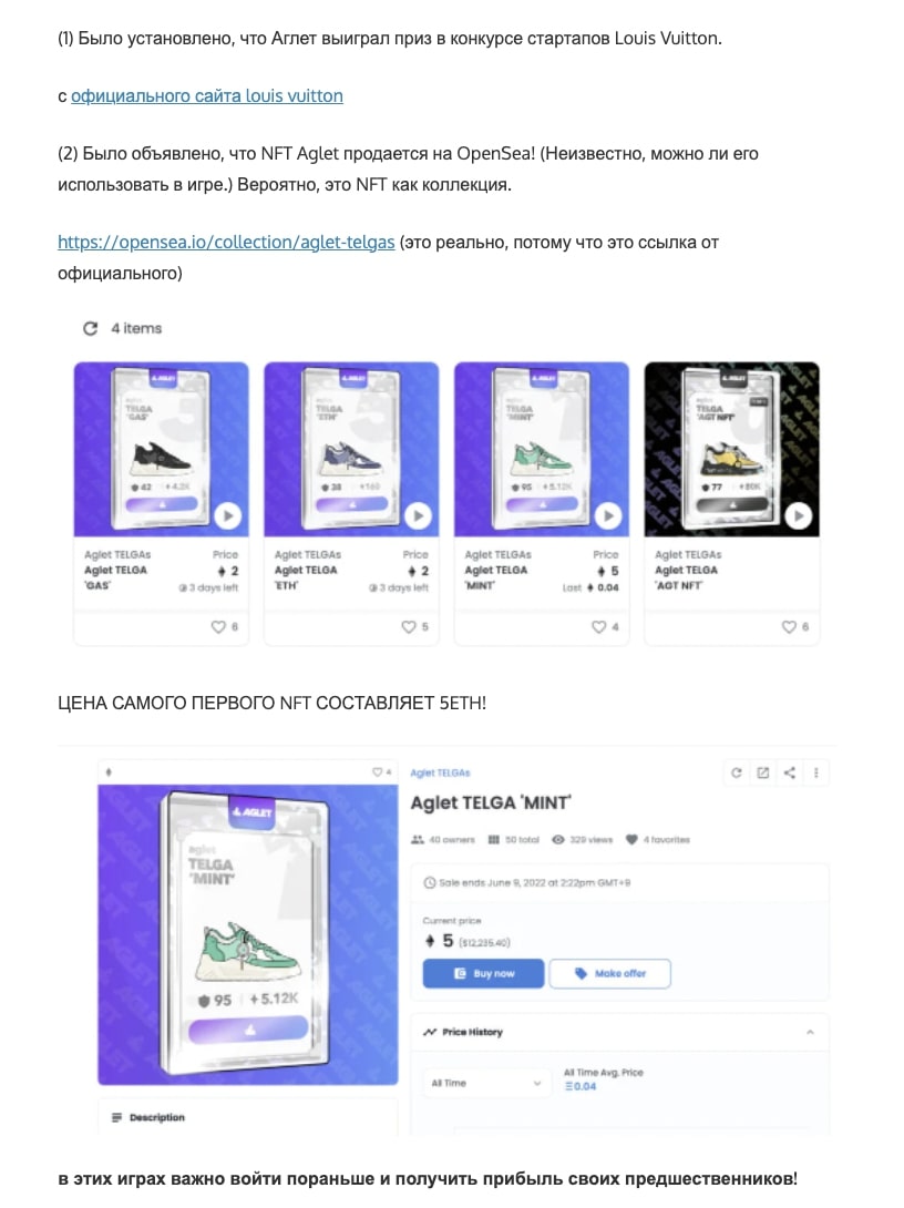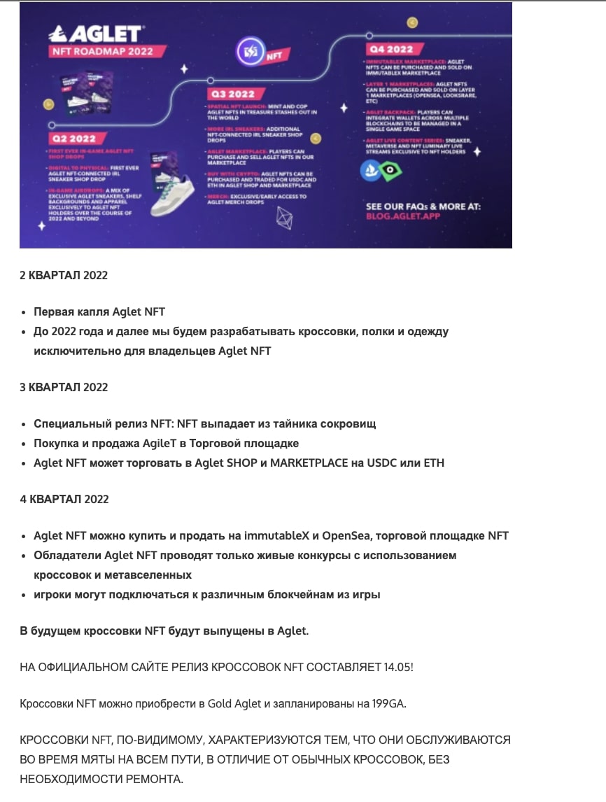 • Q2 2022 - Внутриигровой магазин Aglet NFT; Первый в истории IRL магазин NFT кроссовок Aglet; Эксклюзивные кроссовки Aglet.