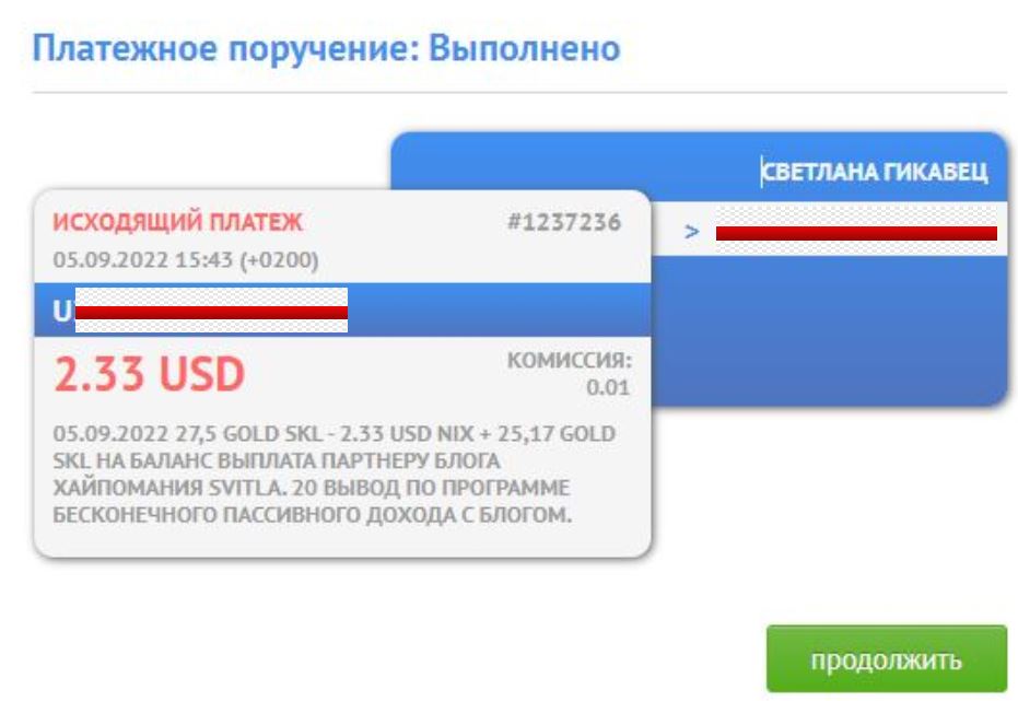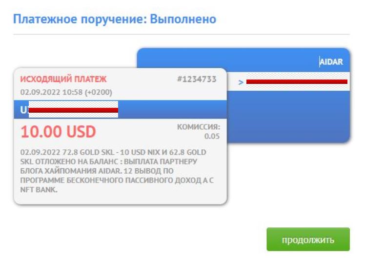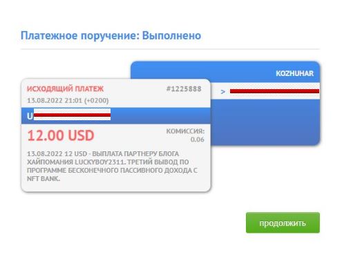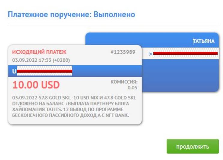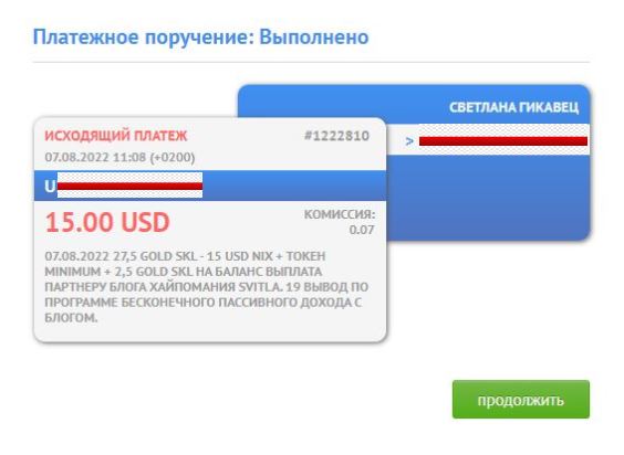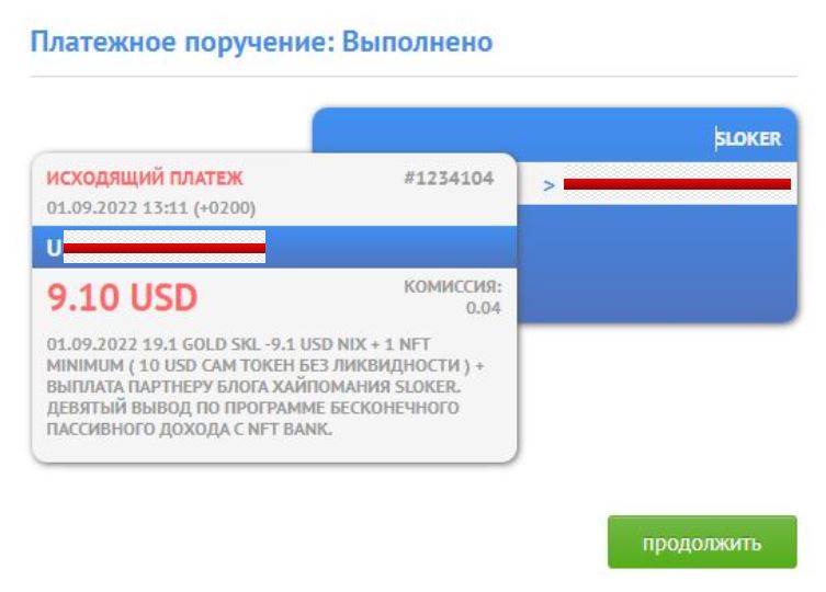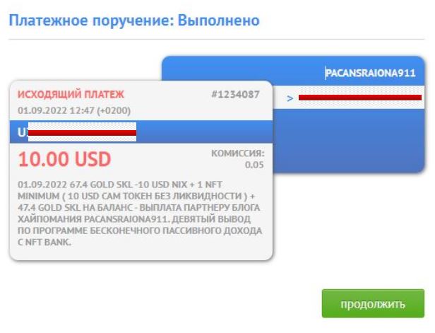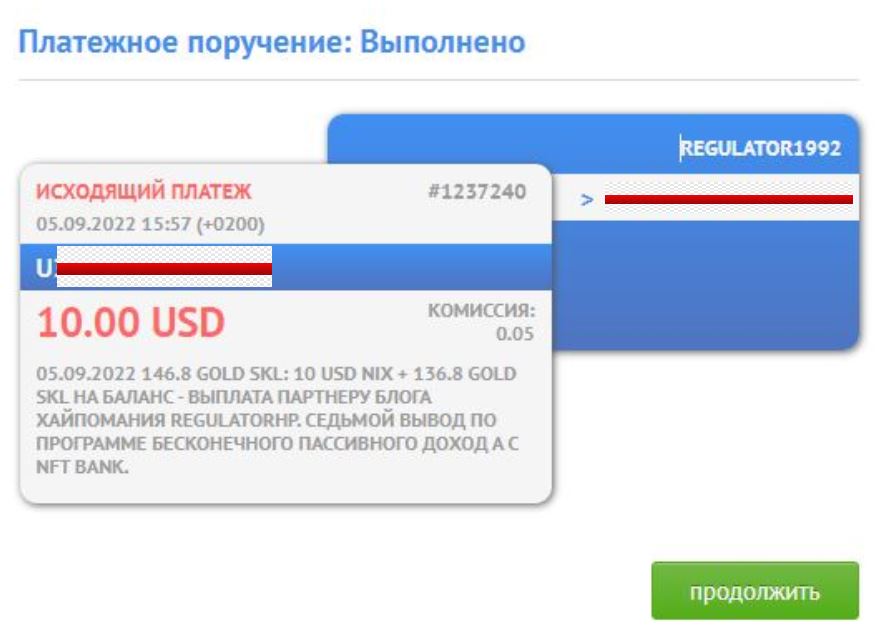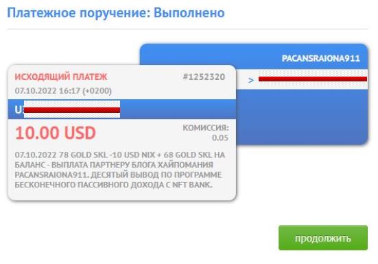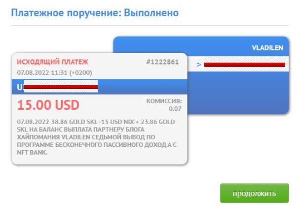 01.09.2022 15.6 GOLD SKL - 10 USD Nix и 5.6 GOLD SKL отложено на баланс - выплата партнеру блога ХайпоМания tfartem Третий вывод по программе бесконечного пассивного доход а с NFT BANK. В обороте: 156 SKL. Капитал на 01.9.2022 в Банке: 578.81 SKL. Израсходовано 10 USD Маны Кабинет по Закольцовке: http://hyipomania.com/forum/viewtopic.p ... 54#p159654 Кабинет NFT Bank: viewtopic.php?p=156486#p156486 Правила вывода по закольцовке на сентябрь 2022: https://t.me/hyipomania_com/2316 Покупка любого NFT с 26.08 до 4.09 от NFT Банка - получение бонуса по акции "Адаптация-15" https://t.me/hyipomania_com/2315