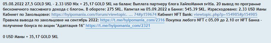 01.09.2022 14.8 GOLD SKL + 14.8 GOLD SKL на баланс - выплата партнеру блога ХайпоМания Drakonovdom. Восьмой вывод по программе бесконечного пассивного дохода с NFT BANK. В обороте: 148 SKL. Капитал на 01.9.2022 в Банке: 188.15 SKL. Израсходовано 0 USD Маны Кабинет по Закольцовке: viewtopic.php?p=159647#p159647 Кабинет NFT Bank: viewtopic.php?p=158038#p158038 Правила вывода по закольцовке на сентябрь 2022: https://t.me/hyipomania_com/2316 Покупка любого NFT с 26.08 до 4.09 от NFT Банка - получение бонуса по акции "Адаптация-15" https://t.me/hyipomania_com/2315