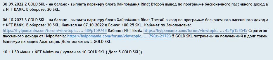 03.09.2022 57.8 GOLD SKL -10 USD Nix и 47.8 GOLD SKL отложено на баланс : выплата партнеру блога ХайпоМания Tatits. 12 вывод по программе бесконечного пассивного доход а с NFT BANK. В обороте: 578 SKL. Капитал на 03.09.2022 в Банке: 616.50 SKL. Израсходовано 10 USD Маны Кабинет по Закольцовке: viewtopic.php?p=159662#p159662 Кабинет NFT Bank: viewtopic.php?p=158000#p158000 Правила вывода по закольцовке на сентябрь 2022: https://t.me/hyipomania_com/2316 Покупка любого NFT с 26.08 до 4.09 от NFT Банка - получение бонуса по акции "Адаптация-15" https://t.me/hyipomania_com/2315