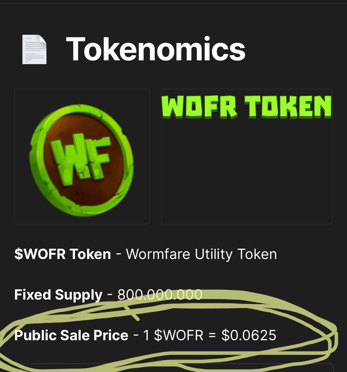 В игре реализован приват сейл будущих токенов $WOFR по цене 0.0625$ за токен. Анонсирован 20% разлок на листинге и затем 8 месяцев разлок по 10% Желающим задонатить рекомендую делать это постепенно, в игре мы начинаем с квестов покупки токенов от 1 USD, потом 10 и тд.