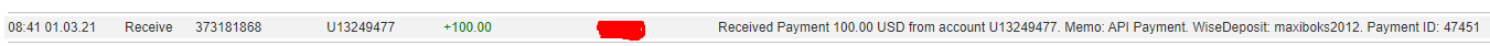 11:58 09.03.21 Receive 375460776 U13249477 +100.00 Received Payment 100.00 USD from account U13249477. Memo: API Payment. WiseDeposit: annakom875.