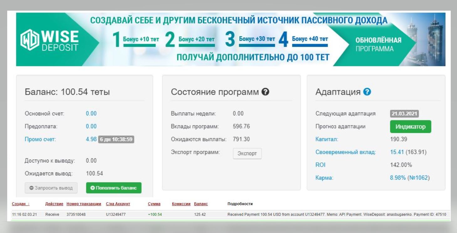 Приветствую, коллеги! Сделал сегодня очередной вклад в сумме 100$! Теперь к адаптации в Wisedeposit я полностью готов! Уже на следующей неделе начнется новая работа и новые выводы средств из проекта, которые гораздо приятнее, чем вклады! Но и без вкладов никуда. Как говорится: «Любишь кататься – люби и саночки возить»! Хочешь получить – вложи для начала. В общем закольцовка – это наше всё. Это защита проекта от скама. Закольцовка рулит!