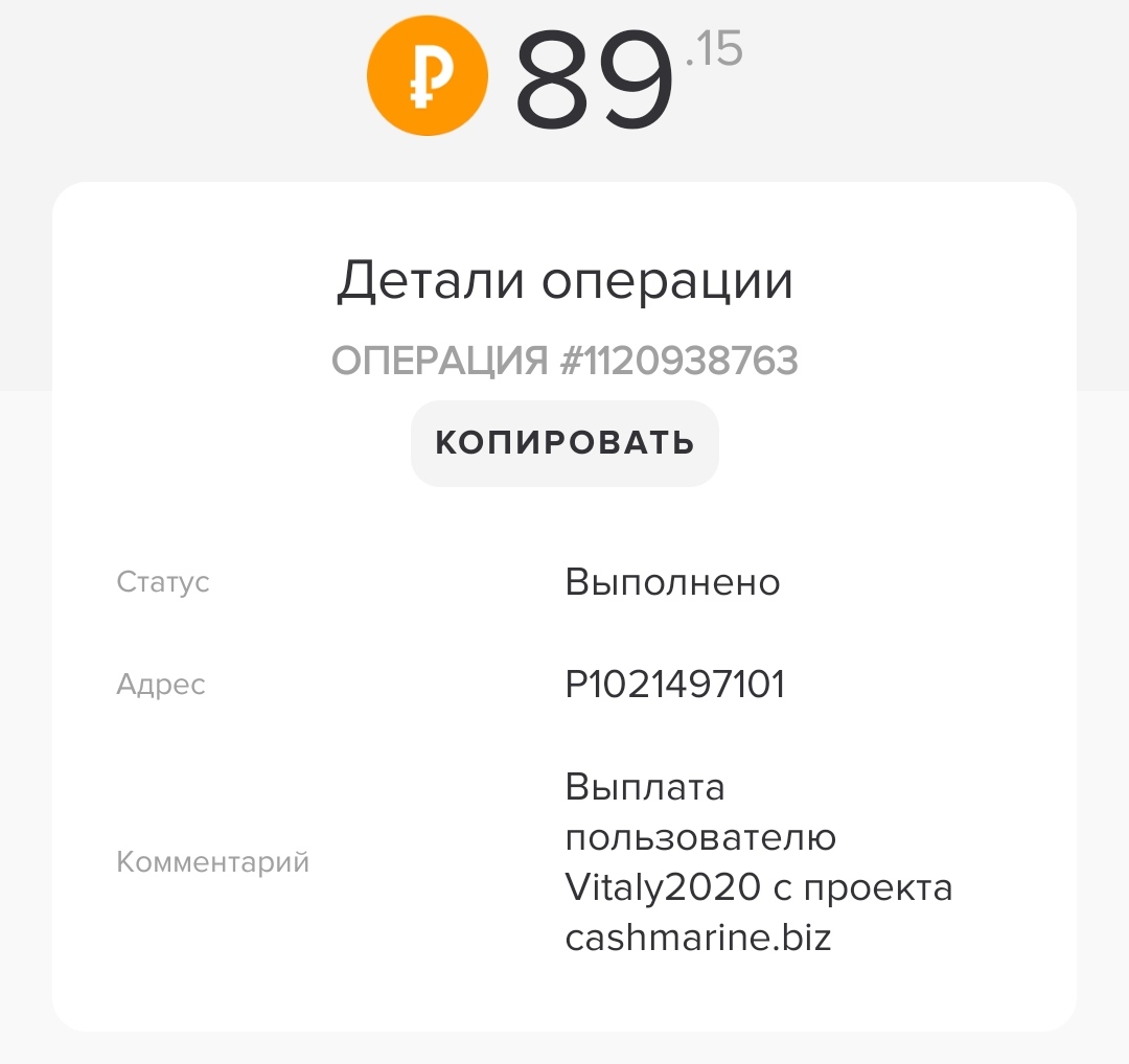 Comment: Amount: 20.00 RUB Выплата с проекта cashmarine.biz