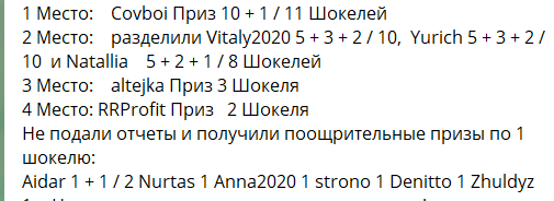 2 Место: разделили Vitaly2020 5 + 3 + 2 / 10, Yurich 5 + 3 + 2 / 10 и Natallia 5 + 2 + 1 / 8 Шокелей