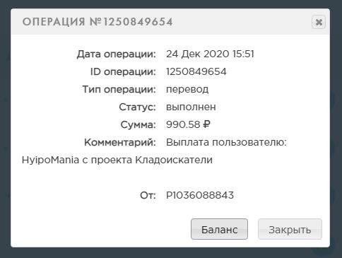 Комментарий: Выплата пользователю: raakot с проекта Кладоискатели