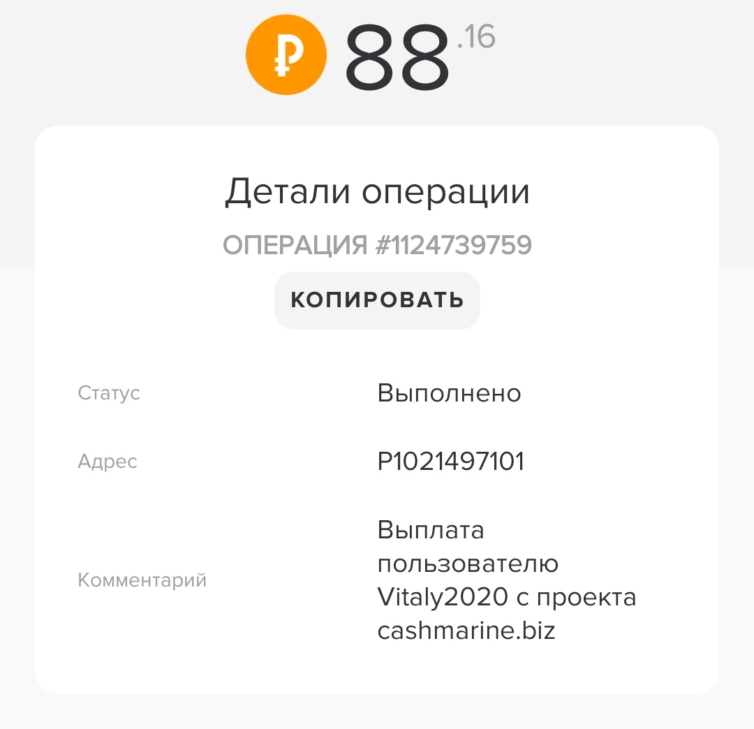 Comment: Amount: 34.99 RUB Выплата с проекта cashmarine.biz