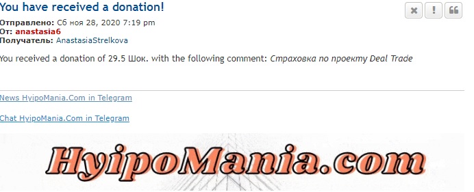 You received a donation of 29.5 Шок. with the following comment: Страховка по проекту Deal Trade