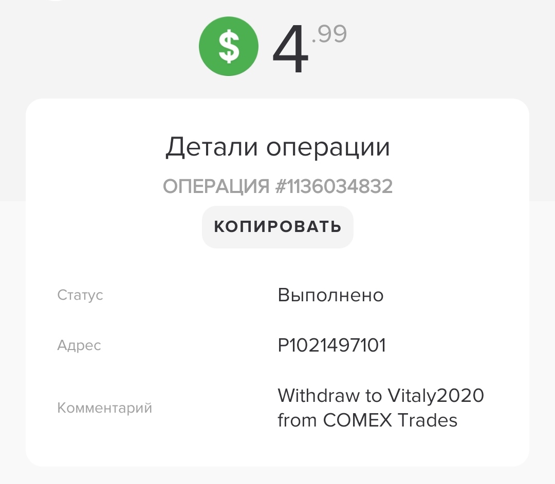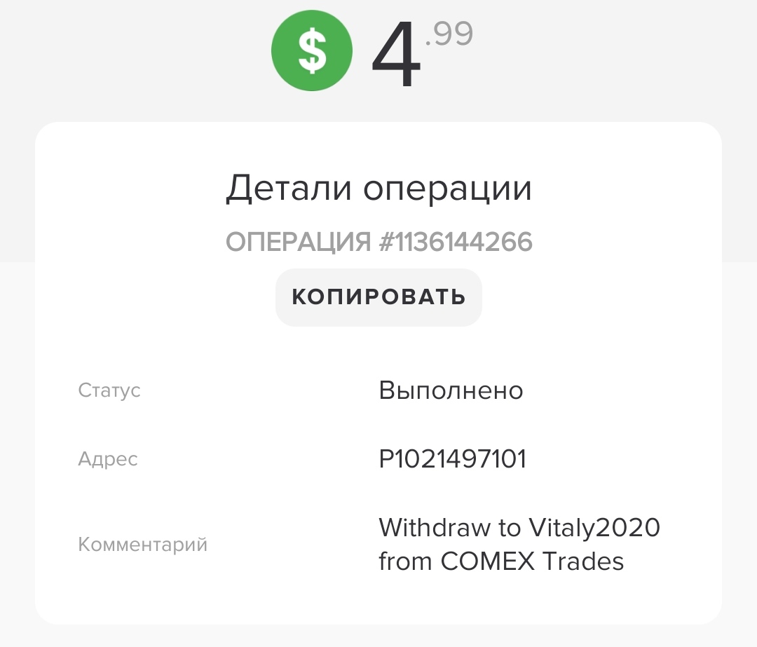 The amount of 1.05 USD has been deposited to your account. Accounts: U20560304->U26. Memo: API Payment. Withdraw from COMEX Trades.. Date: 11:21 05.09.20. Batch: 332901690.