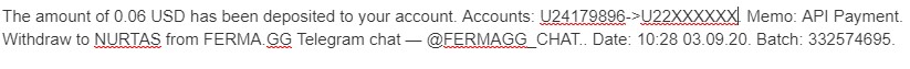 Drift +0.99 66.25 Received Payment 0.99 USD from account U24179896. Memo: API Payment. Withdraw to COVBOI from FERMA.GG Telegram chat — @FERMAGG_CHAT. Payment ID: 270747