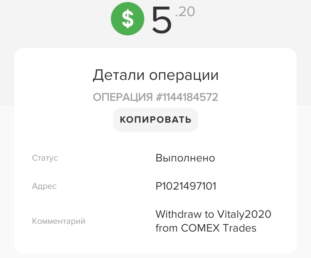 The amount of 1.05 USD has been deposited to your account. Accounts: U20560304->U26. Memo: API Payment. Withdraw from COMEX Trades.. Date: 12:41 11.09.20. Batch: 333866192