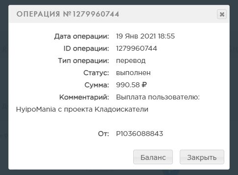 Комментарий: Выплата пользователю: raakot с проекта Кладоискатели