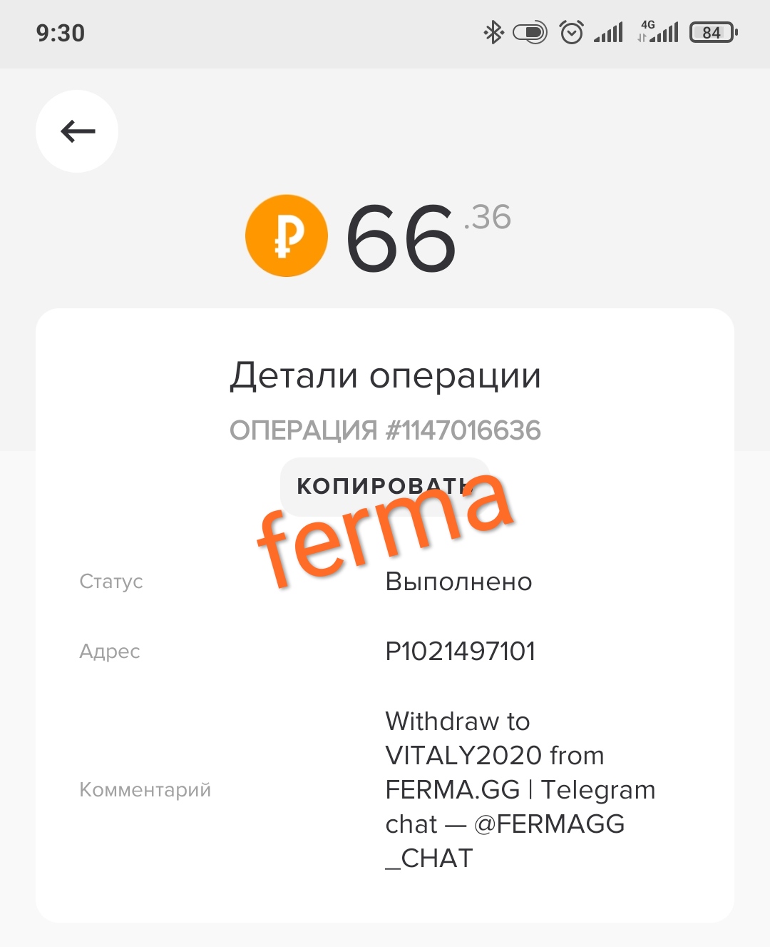 Comment: Amount: 50.00 RUB Withdraw from FERMA.GG