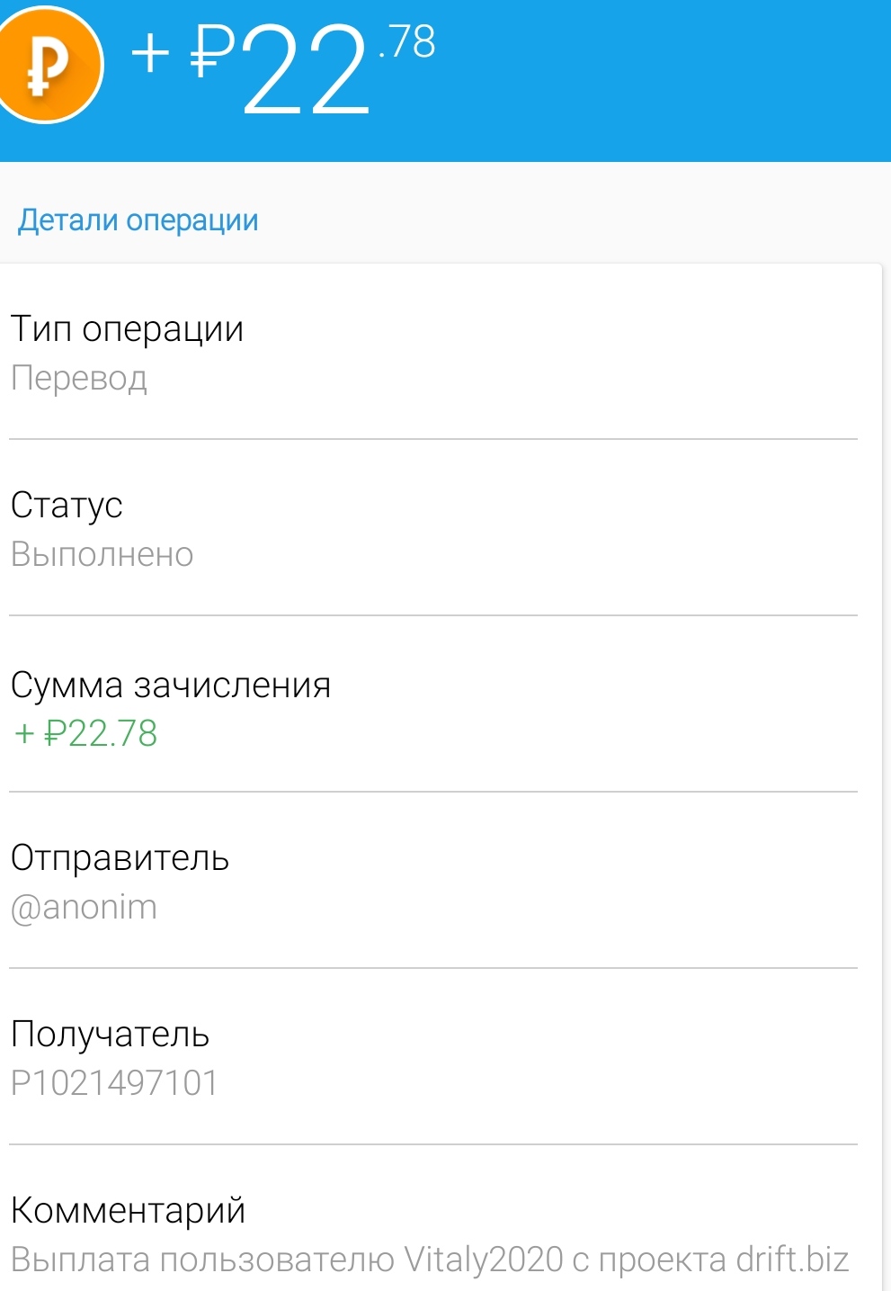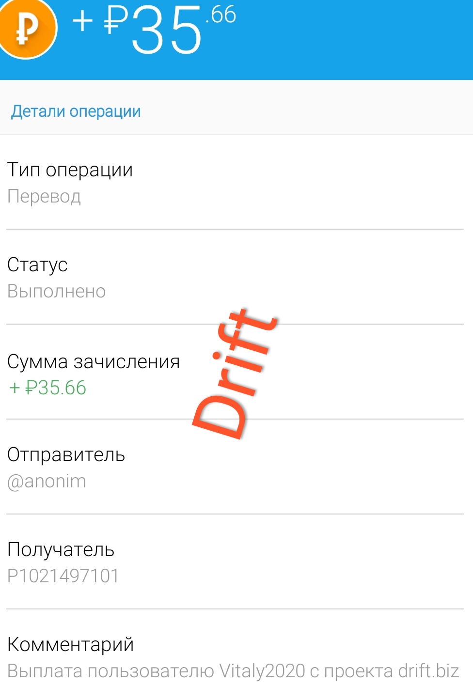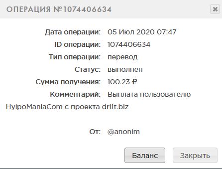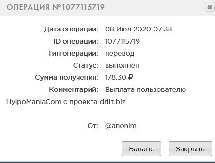 Payment Received + 54.48 RUB Date: 02.07.2020 21:03:29 (UTC+3) ID: 1072322400 Details: anonim → P46 Comment: Amount: 54.48 RUB Выплата с проекта drift.biz