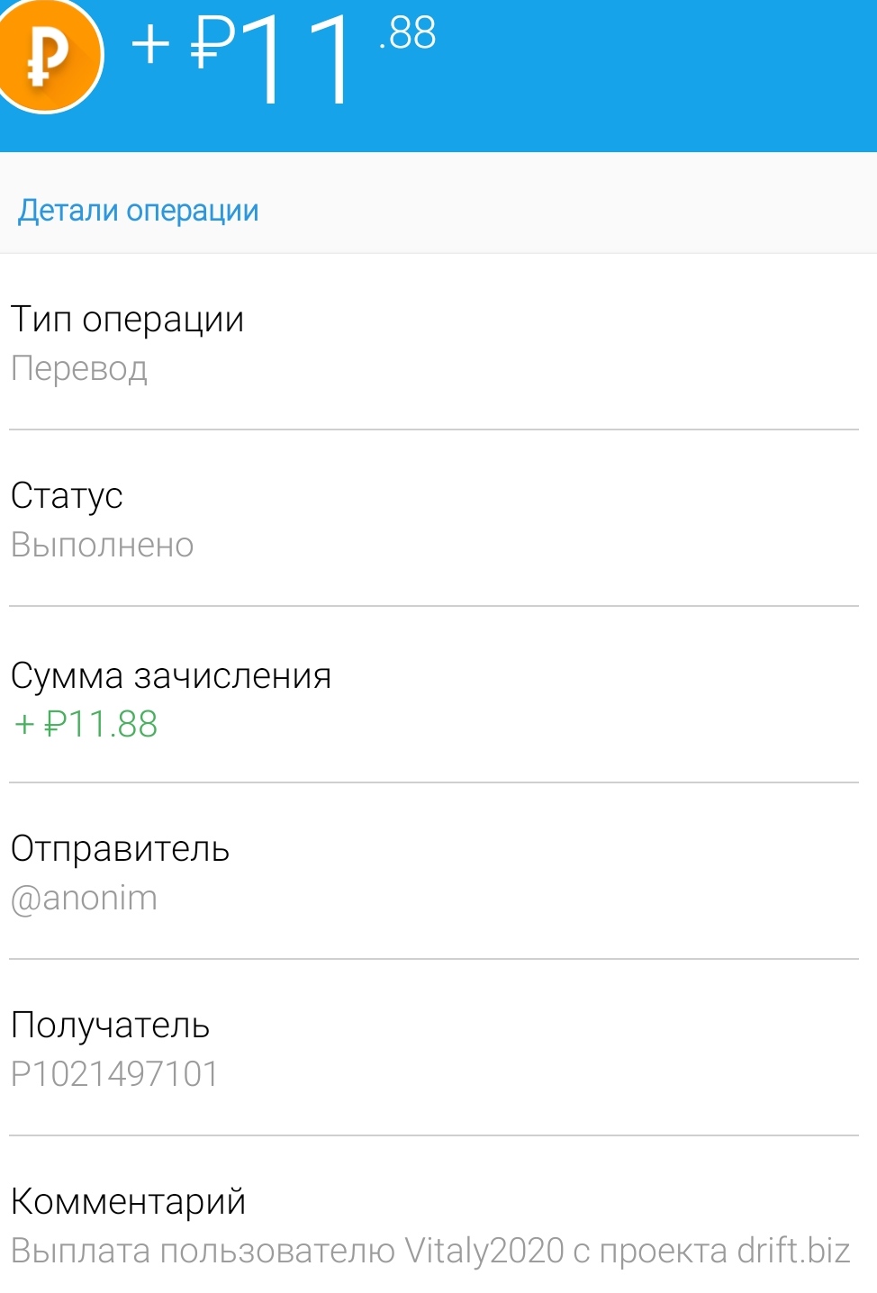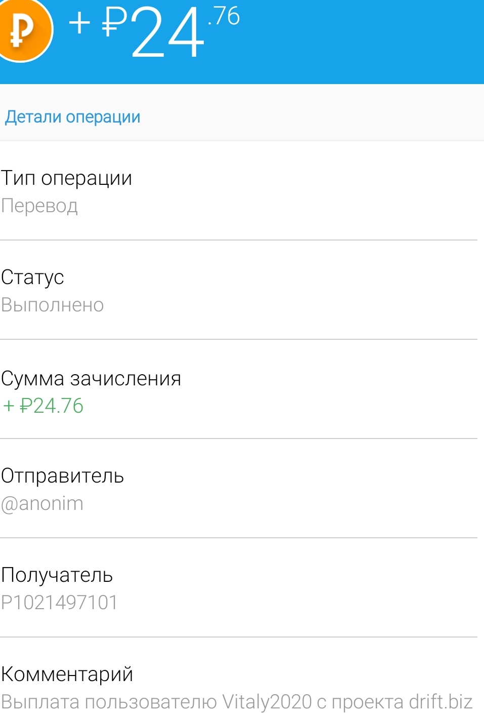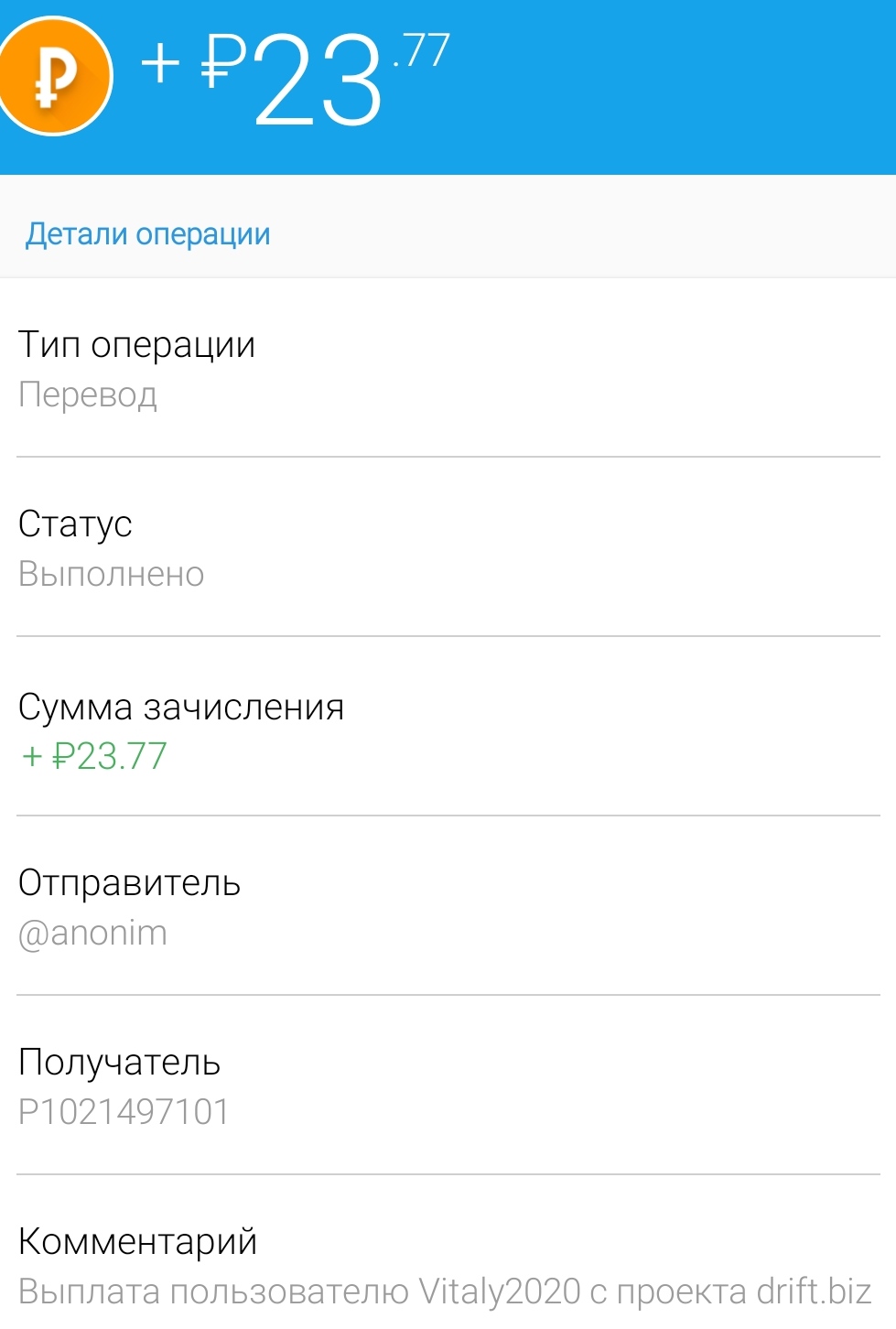 Payment Received + 54.48 RUB Date: 02.07.2020 21:03:29 (UTC+3) ID: 1072322400 Details: anonim → P46 Comment: Amount: 54.48 RUB Выплата с проекта drift.biz