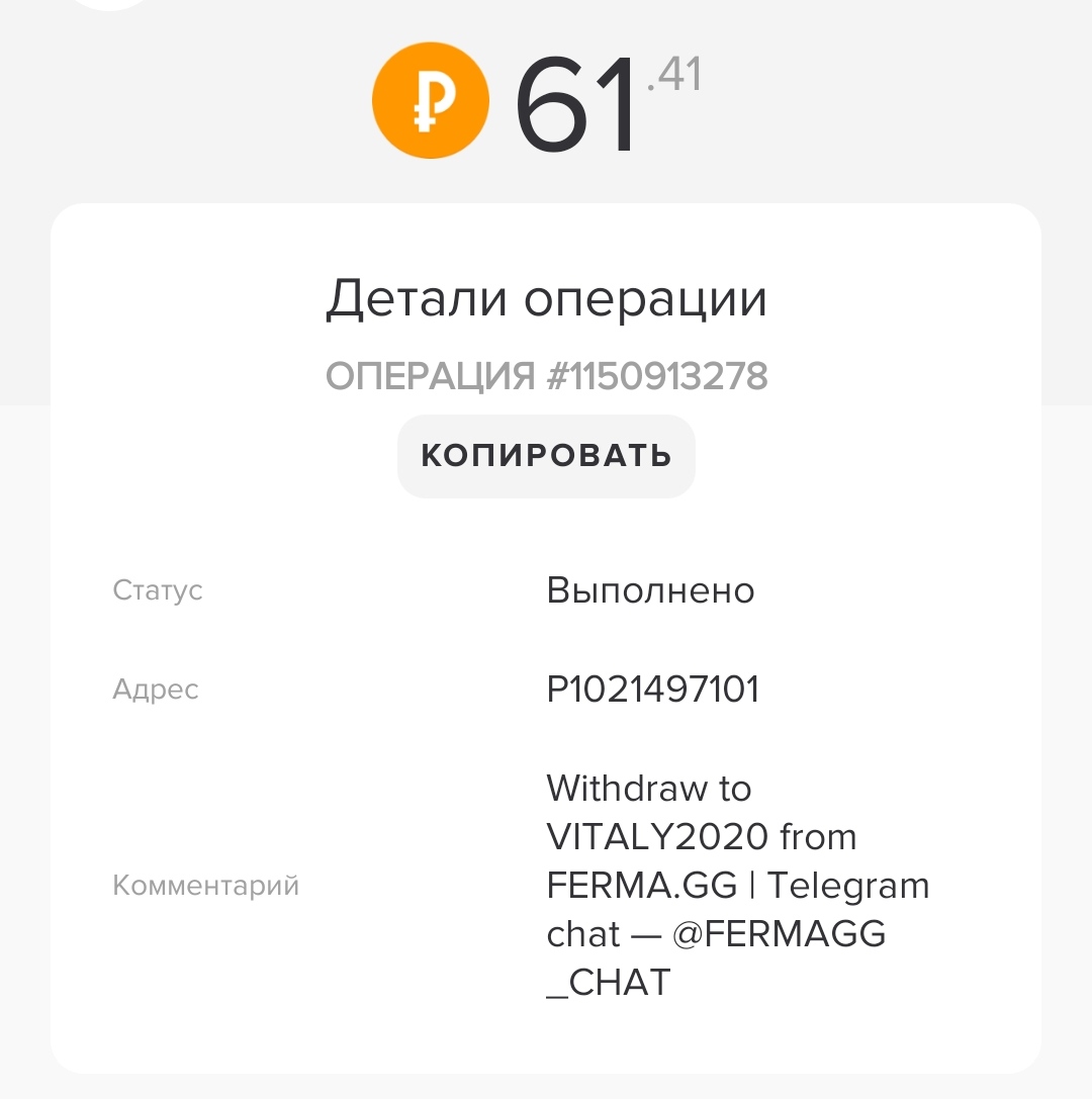 Withdraw to EVGENY80 from FERMA.GG | Telegram chat — @FERMAGG_CHAT
