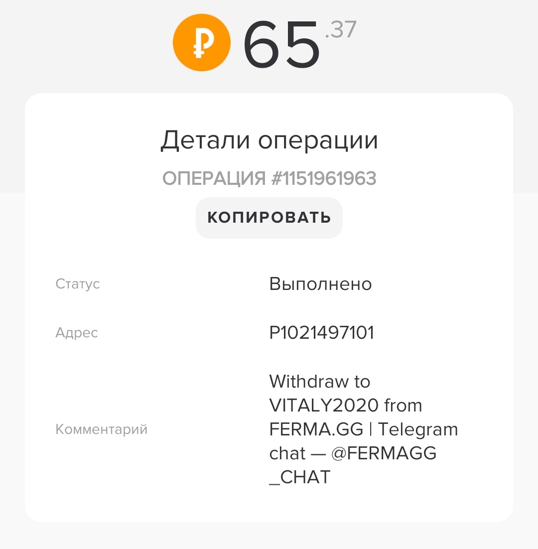 Comment: Amount: 70.00 RUB Withdraw from FERMA.GG