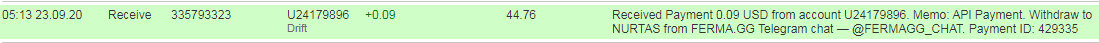 Drift +0.55 199.75 Received Payment 0.55 USD from account U24179896. Memo: API Payment. Withdraw to COVBOI from FERMA.GG Telegram chat — @FERMAGG_CHAT. Payment ID: 425503