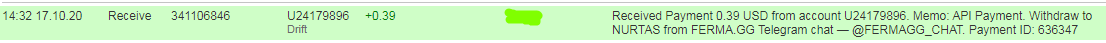 The amount of 0.45 USD has been deposited to your account. Accounts: U24179896->U190. Memo: API Payment. Withdraw from FERMA Date: 19:41 17.10.20. Batch: 341172847. инвестирую с PH
