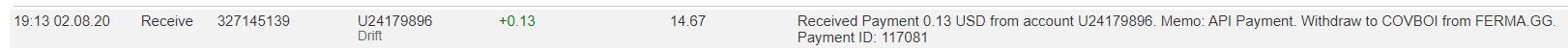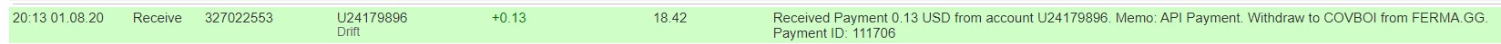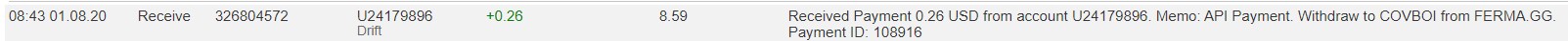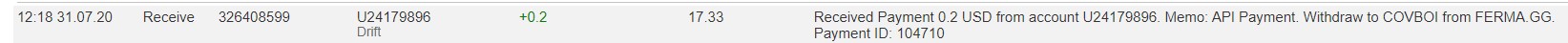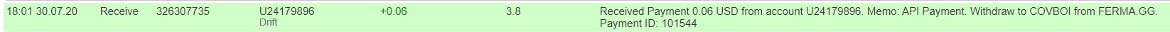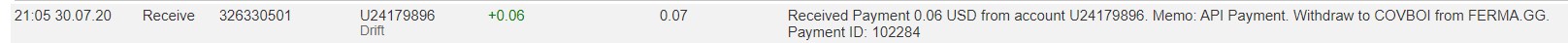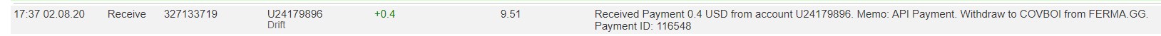 The amount of 0.69 USD has been deposited to your account. Accounts: U24179896->U190. Memo: API Payment. Withdraw from FERMA.GG.. Date: 05:30 30.07.20. Batch: 326204747.