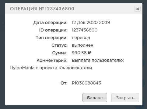 Комментарий: Выплата пользователю: raakot с проекта Кладоискатели