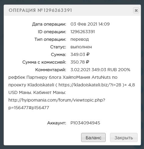 3.02.2021 349.03 RUB 200% рефбек Партнеру блога ХайпоМания ArtuNuts по проекту Kladoiskateli ( https://kladoiskateli.biz/?i=28 )+ 4,8 USD Маны. Кабинет Маны: viewtopic.php?p=156477#p156477
