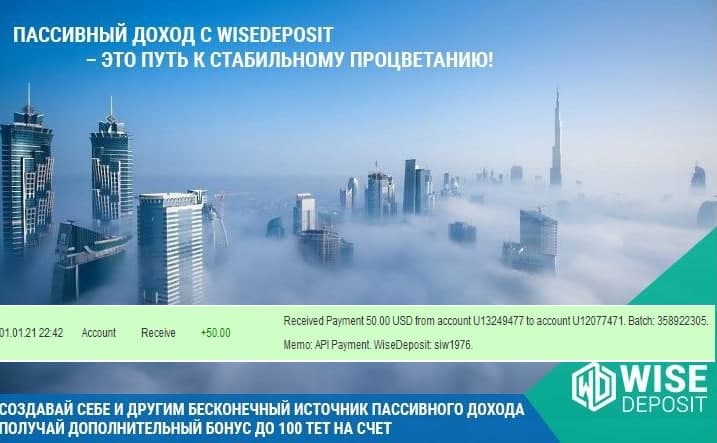 Очередная выплата в проекте WiseDeposit 50$.Также получила бонус за отзывы в размере 1.5$.Благодарность проекту WiseDeposit за возможность копить, наращивать капитал, получать пассивный доход, развиваться!!!.Присоединяйтесь в команду и научитесь использовать все возможности инвестиционных программ