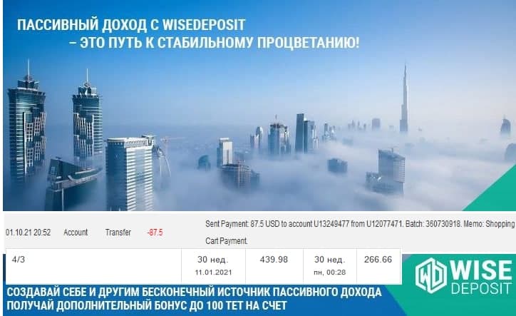 Супер! Очередная выплата в проекте WiseDeposit 36.15$.:positive: Ранее получила бонусы по программе ВерниДеньги! За счет собственных средств и бонусов проекта WiseDeposit я делаю депозиты и планирую идти на Закольцовку, которая дает возможность получать пассивный доход! Благодарность проекту WiseDeposit за возможность копить, наращивать капитал, получать пассивный доход, развиваться!!!Присоединяйтесь в команду и научитесь использовать все возможности инвестиционных программ.