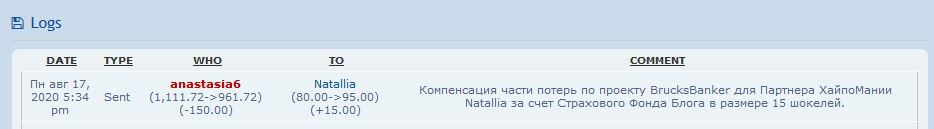 Компенсация части потерь по проекту BrucksBanker для Партнера ХайпоМании Natallia за счет Страхового Фонда Блога в размере 15 шокелей.