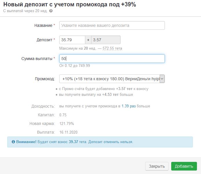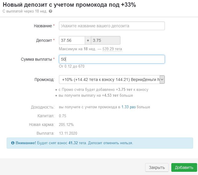 На один депозит вам прибавится 10% или 20% от суммы вклада. Половину промокода можно использовать с 16-ой недели (прибавится 10% к депозиту), а половину с 26 недели (это 20%).
