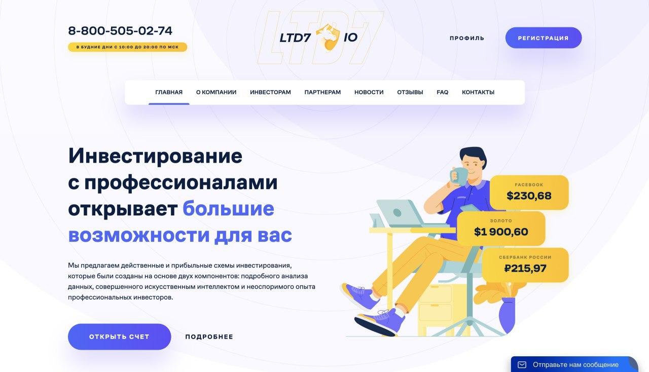 Интернет-сервис LTD7 предоставляет возможность каждому из вас инвестировать в торговлю акциями мировых компаний и зарабатывать от 5% за 3 дня не выходя из дома и без наличия каких-либо навыков.