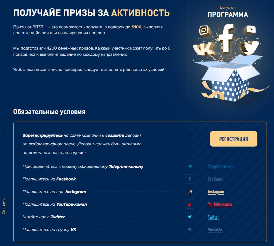 Призы от BITSTIL – это возможность получить в подарок до $100, выполняя простые действия для популяризации проекта.