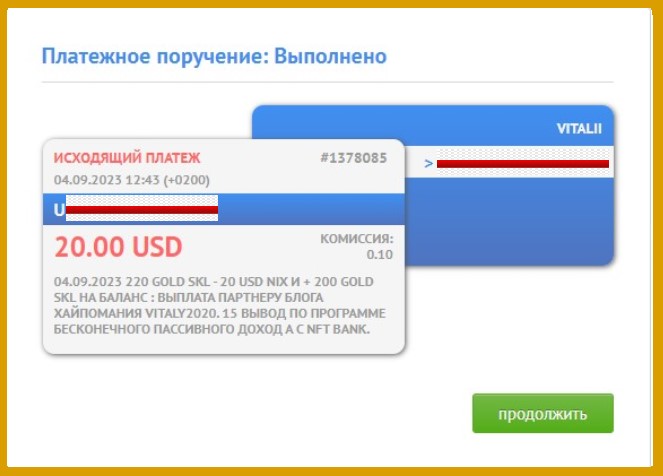 Участие в Плане Оптимальный-1 с депозитом 20 USD до 20.07: это получение до 100 USD ежемесячно в Лотерее NFT Bank https://t.me/hyipomania_com/2519 , до 250 USD ежемесячно по акции Адаптация https://t.me/hyipomania_com/2510 и до 100 USD ежемесячно по Закольцовке с NFT Bank https://t.me/hyipomania_com/248802.08.2023 60 GOLD SKL - 15 USD Nix и 45 GOLD SKL отложено на баланс - выплата партнеру блога ХайпоМания tfartem 13 вывод по программе бесконечного пассивного доход а с NFT BANK. В обороте: 600 SKL. Капитал на 06.05.2023 в Банке: 1,050.00 regular SKL. Израсходовано 15 USD Маны Кабинет по Закольцовке: https://hyipomania.com/forum/viewtopic. ... 37#p160237 Кабинет NFT Bank: https://hyipomania.com/forum/viewtopic. ... 86#p156486 Участие в Плане Оптимальный-1 с депозитом 20 USD до 20.07: это получение до 100 USD ежемесячно в Лотерее NFT Bank https://t.me/hyipomania_com/2519 , до 250 USD ежемесячно по акции Адаптация https://t.me/hyipomania_com/2510 и до 100 USD ежемесячно по Закольцовке с NFT Bank https://t.me/hyipomania_com/2488