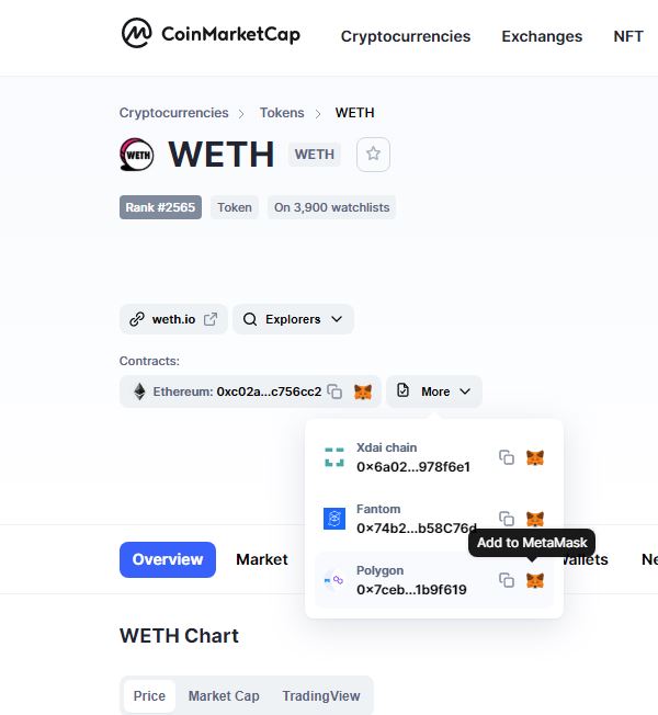 4. Добавляем токен WETH в новую сеть. Для этого открываем страницу https://coinmarketcap.com/currencies/weth/