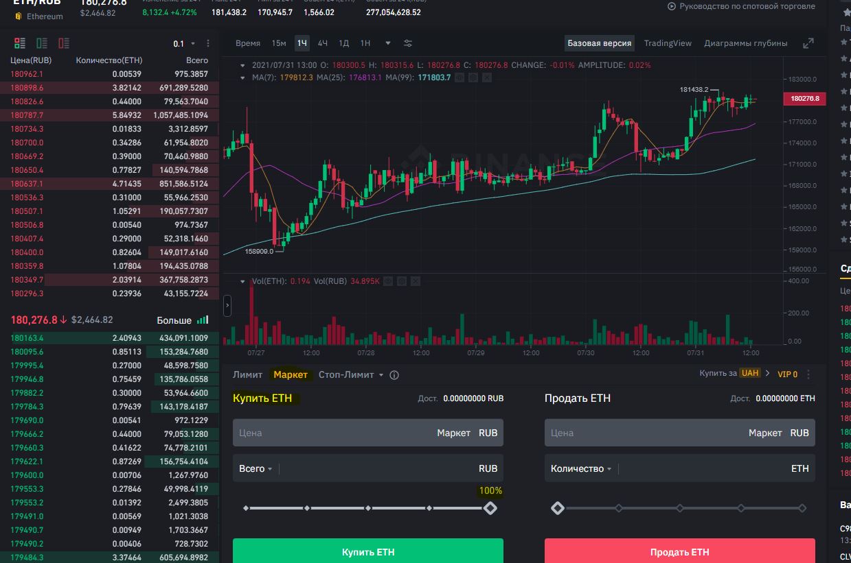 https://www.binance.com/ru/trade/ETH_RUBКнопки - Маркет - ползунок на 100% если хотите купить на всю сумму - Купить ETH