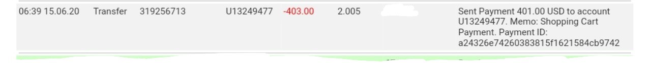The amount of 14.5 USD has been withdrawn from your account. Accounts: U20->U13249477. Memo: Shopping Cart Payment. . Date: 05:48 22.06.20. Batch: 320215709.