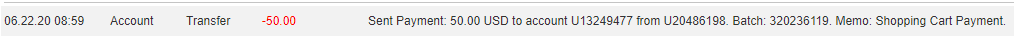 The amount of 50 USD has been withdrawn from your account. Accounts: U12->U13249477. Memo: Shopping Cart Payment. . Date: 22:07 15.06.20. Batch: 319231023.