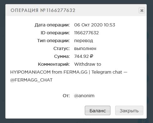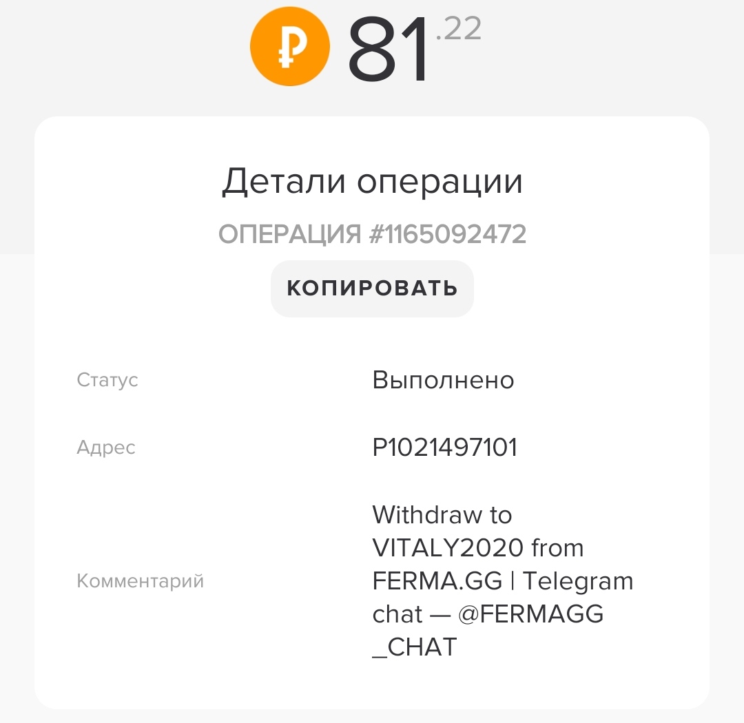 Withdraw to EVGENY80 from FERMA.GG | Telegram chat — @FERMAGG_CHAT