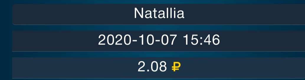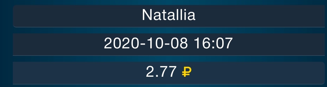 Дата: 10 Окт 2020 20:31 ID: 1171034813 Тип: перевод Статус: выполнен Сумма: 99.05